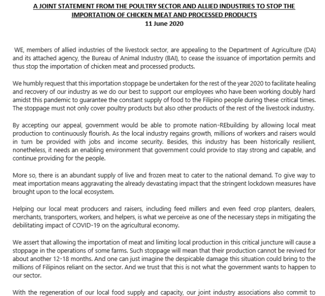 Signatories to the letter to Malacanang include Phil. Chamber of Agriculture and Food Inc (Danilo V. Fausto); Nat’l. Federation of Hog Farmers (Chester Warren Y. Tan); Phil. Assn of Feedmillers Inc. (Stephanie Nicole S. Garcia); Phil Maize Federation Inc. (Roger V. Navarro); Phil. College of Poultry Practitioners (Dr.Cesar F. POlicarpio); Phil. Veterinary Drug Assn (Dr. Eugenio P. Mende); Phil Eggboard Assn (Atty. Irwin M. Ambal); PVDA Found Inc. (Danilo A. Sanchez); and Phil. Veterinary Medical Assn (Dr. Corazon P. Occidental).
