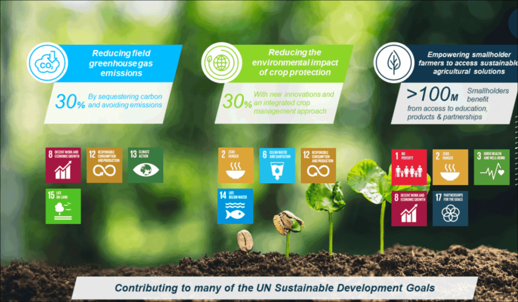 Sustainability is an integral part of its strategy and values, with sustainability targets that include reducing the environmental impact of crop protection while promoting sustainable production and circular options that reduce, recycle, reuse and replace.